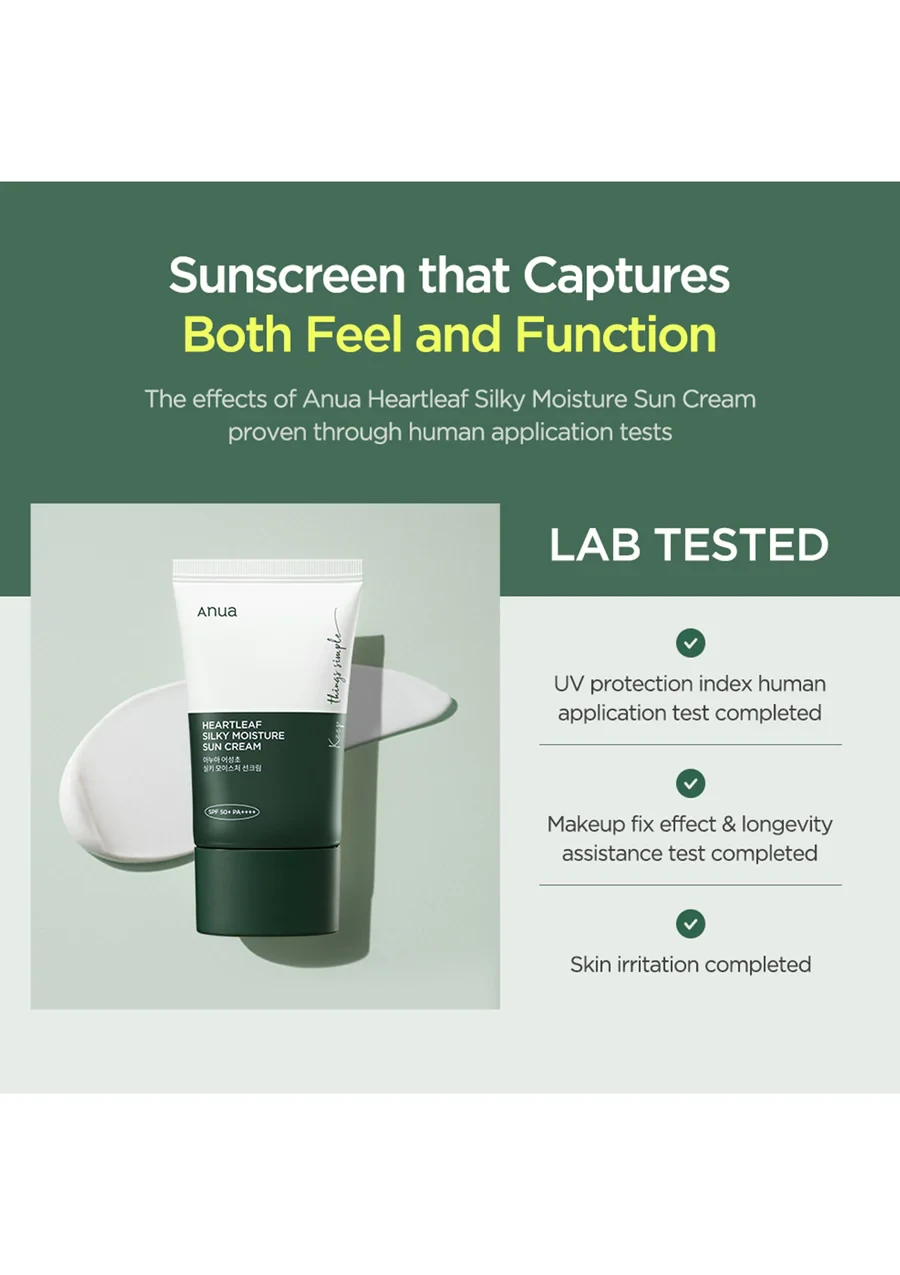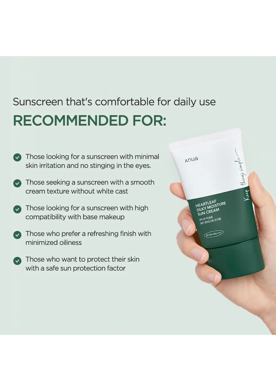 Anua Heartleaf Silky Moisture Sun Cream, your year-round companion for radiant, protected, and beautifully moisturized skin. This exceptional sun cream boasts a unique formula that seamlessly adheres to your skin, leaving it silky smooth without any uncomfortable heaviness or cloudiness. Say goodbye to that greasy sunscreen feel and embrace a product that's perfect for use 365 days a year.