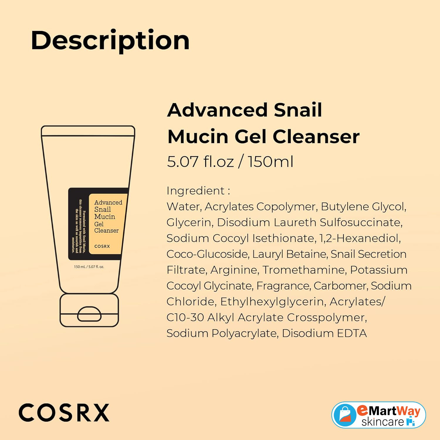 Water, Acrylates Copolymer, Butylene Glycol, Glycerin, Disodium Laureth Sulfosuccinate, Sodium Cocoyl Isethionate, 1,2-Hexanediol, Coco-Glucoside, Lauryl Betaine, Snail Secretion Filtrate, Arginine, Tromethamine, Potassium Cocoyl Glycinate, Fragrance, Carbomer, Sodium Chloride, Ethylhexylglycerin, Acrylates/C10-30 Alkyl Acrylate Crosspolymer, Sodium Polyacrylate, Disodium EDTA