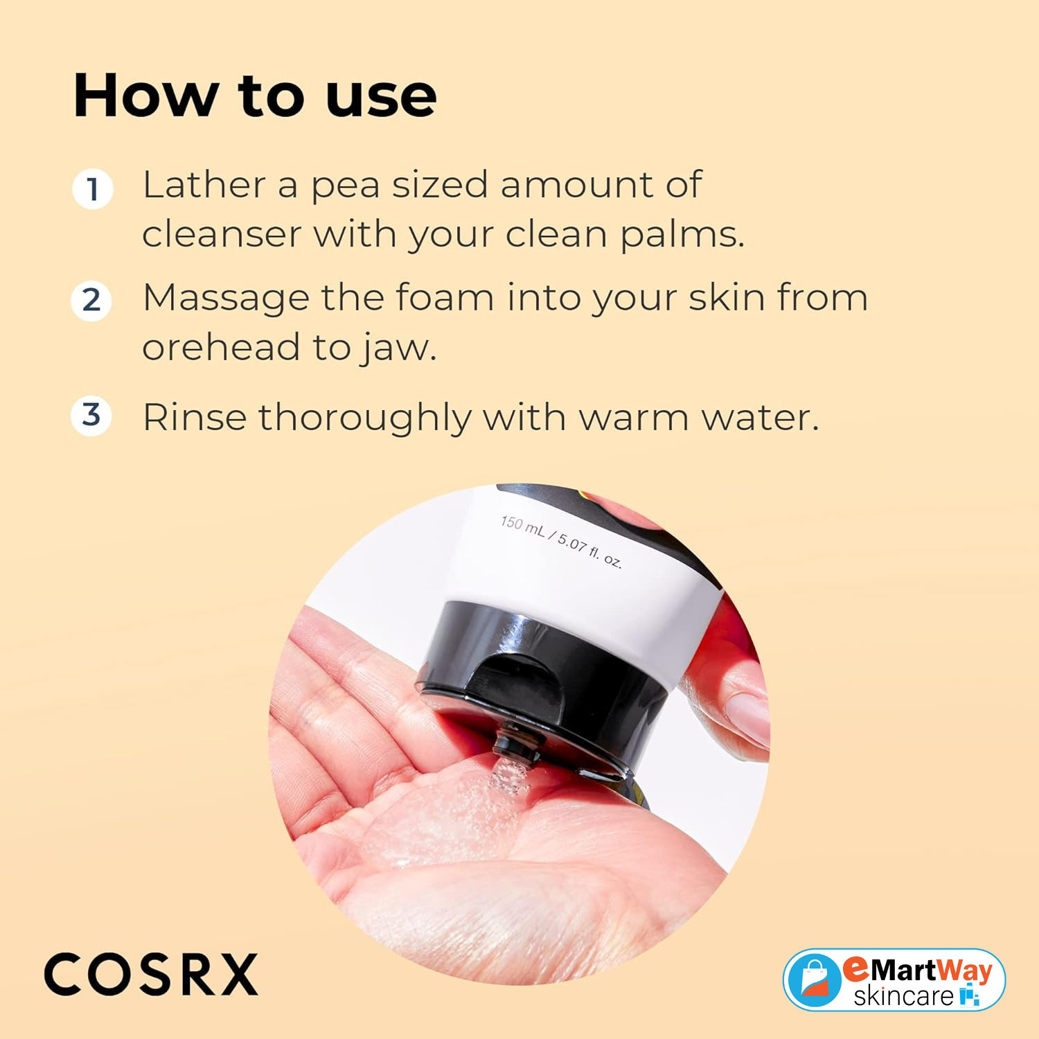 Wet your face and lather a pea sized amount of cleanser between your palms. Massage the foam into your skin from forehead to jaw. Rinse thoroughly with warm water.