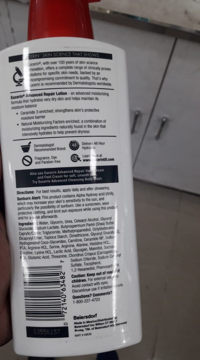 Eucerin Advanced Repair Lotion is a breakthrough in repairing very dry skin and fighting dryness at its source. It provides 48 hour moisture, for skin that looks and feels healthy. This body lotion for dry skin is enriched with Ceramides-3 and Natural Moisturizing Factors. Ceramides help to strengthen the skin’s moisture barrier to lock in moisture. Natural Moisturizing Factors, amino acids that are naturally found in the skin, boost moisture and prevent dryness from reoccurring. Eucerin Advanced Repair Body Lotion is a lightweight and fast-absorbing formula that smoothes, repairs & hydrates dry skin. This body lotion is fragrance free, dye free, paraben free and is gentle enough for everyday use. To Use: Smooth over body daily. For best results, apply after showering. Pair with Eucerin Advanced Repair Cleanser for a full skin care regimen to give your skin the dermatological attention it needs.