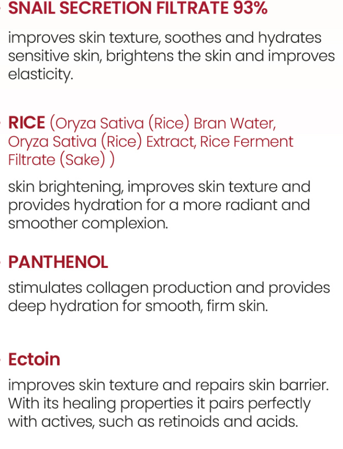 Snail Secretion Filtrate, Caprylic/Capric Triglyceride, 1,2-Hexanediol, Cetearyl Alcohol, Dimethicone, Water, Cetearyl Olivate, Carbomer, Arginine, Benzyl Glycol, Sorbitan Olivate, Oryza Sativa (Rice) Bran Water, Allantoin, Sodium Polyacrylate, Ethylhexylglycerin, Disodium EDTA, Butylene Glycol, Oryza Sativa (Rice) Extract, Rice Ferment Filtrate (Sake), Panthenol, Ectoin, Sodium Hyaluronate