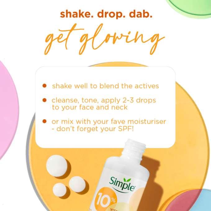 Antioxidant Vitamin C gets glowing reviews for good reason. It’s naturally brilliant at brightening your complexion, reducing fine lines and protecting against environmental aggressors like pollution and blue light. Safe for every skin type, Simple 10% Vitamin C + E + F* Booster Serum is powered by high-performance, 95% naturally derived ingredients to supercharge your skin care routine for instant, visible results. Packed with 10% active ingredients, this skin care product contains 2% of a skin-kind Vitamin C Derivative that’s more stable than ascorbic acid and won’t irritate dry or sensitive skin. 1% Vitamin E nourishes the skin and boosts the effectiveness of Vitamin C while 7% Vitamin F moisturises and strengthens the skin barrier. Like all Simple products, this face serum is dermatologically tested and non-comedogenic, contains no harsh chemicals and is free from alcohol, mineral oils, artificial colours and perfume. This Simple product is also PETA-Approved Vegan – we don’t test on animals anywhere in the world. Shake, drop, dab – it’s that simple. After using a cleanser, apply our non-sticky, non-greasy face serum alone, or mix a few drops into your favourite moisturiser for a super-quick Vitamin C boost. Oh, and it’s fab under makeup too. Try cocktailing it with Simple 3% Hyaluronic Acid + Vitamin B5* Booster Serum (a few drops of each) in the morning, and remember to always apply your SPF afterwards. The best part? Real people love it. 83% agreed their skin felt instantly smoother and softer and 8 out of 10 liked how the serum felt. The stats don’t lie, so try it yourself – we’d love to know what you think of our face serums, so leave us a review. *percent value represents cumulative concentration in the formula.