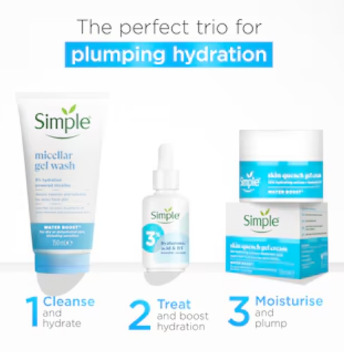 After cleansing with Simple Water Boost Micellar Facial Gel Wash, we recommend applying Simple Water Boost Hydrating Booster all over your face to instantly hydrate your skin and help it stay hydrated for longer. Finish with Simple Hydrating Gel Cream to complete your hydration skincare routine.